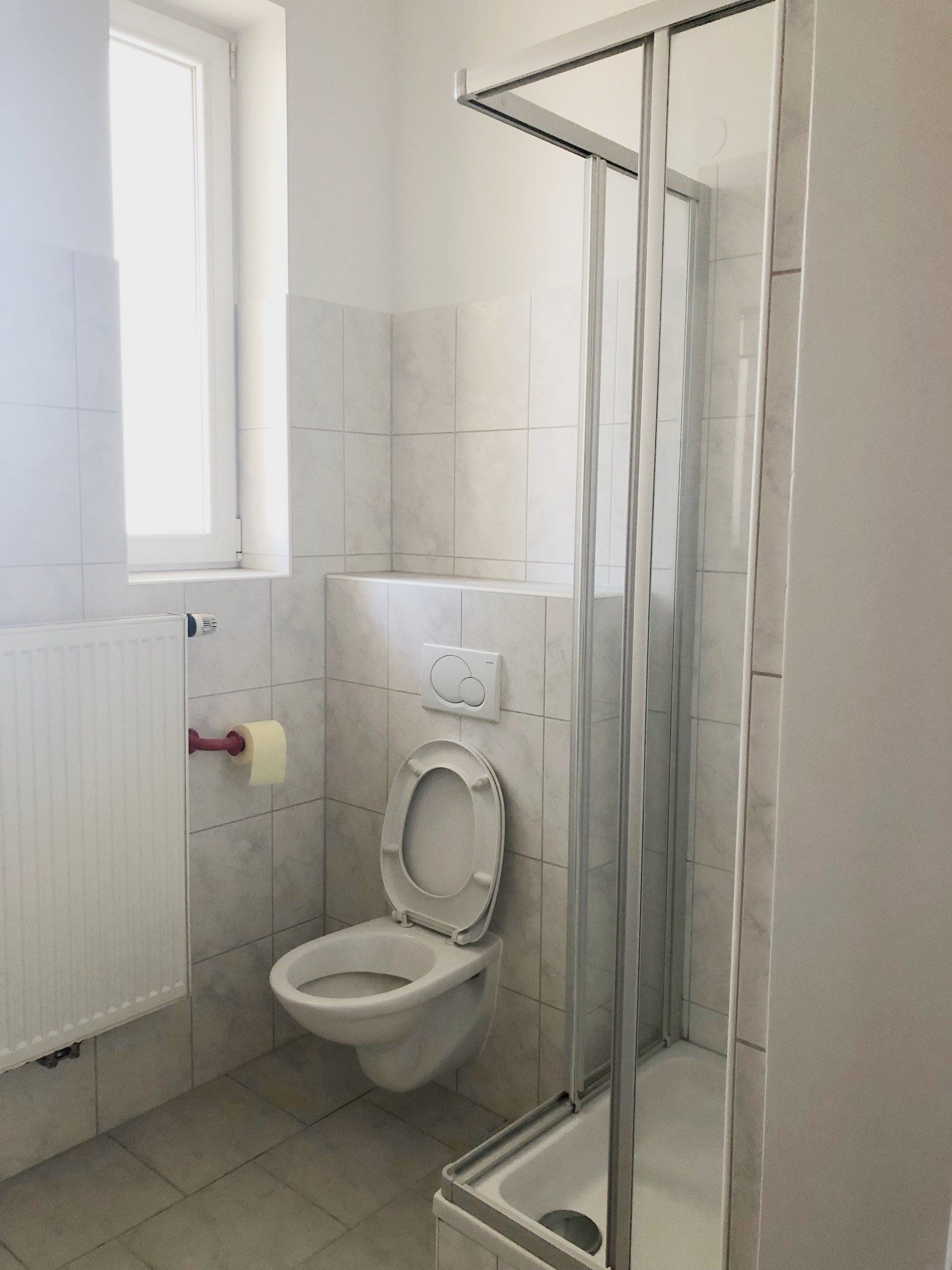 Badezimmer mit Dusche, Waschbecken, WC, Waschmaschinenanschluss
